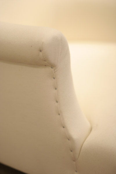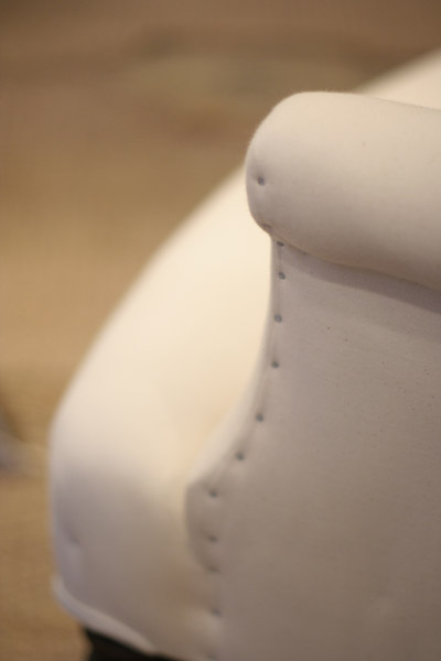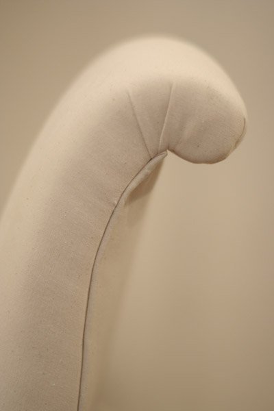 The Scroll-back Chair is a replica of a French early 19th Century chair of the Napoleonic age. Delicate and a little raffish, this Pimpernel classic is freshly covered in cream calico, with three buttons, brown legs and brass castors.